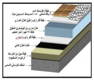 - تغطية المادة العازلة بطبقة واقية من الخرسانة أو المونة.